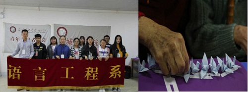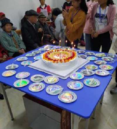 气温的骤降熄灭不了学生活动志愿者的热情,在敬老院相关工作人员的协助下,同学们和老人围坐一席。同学们有序的为老人表演了丰富多彩的节目。在同学们的热情感染下,老人们也自发的上台表演,有的吹起了笛子,有的唱起了歌……趁着表演间隙,部分老人与志愿者一起用千纸鹤粘了“生日快乐”字样作为“鹤”寿之礼。