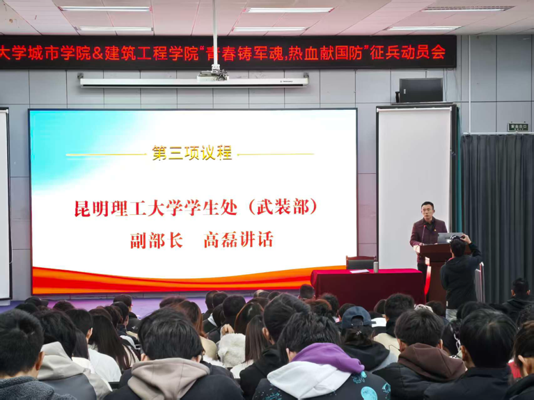 为激发青年学子参军报国热情、厚植爱国强军情怀,12月18日下午14时,昆明理工大学城市学院及建筑工程学院“青春铸军魂,热血献国防”征兵动员会在建工200报告厅举行。出席本次动员会的领导和嘉宾分别是学校武装部相关负责人、昆明市五华区军队离休退休干部服务中心军休干部和党委书记、城市学院党委副书记、建筑工程学院征兵工作负责老师、城市学院学工、团委、各系征兵工作负责老师及学生共计300余人。