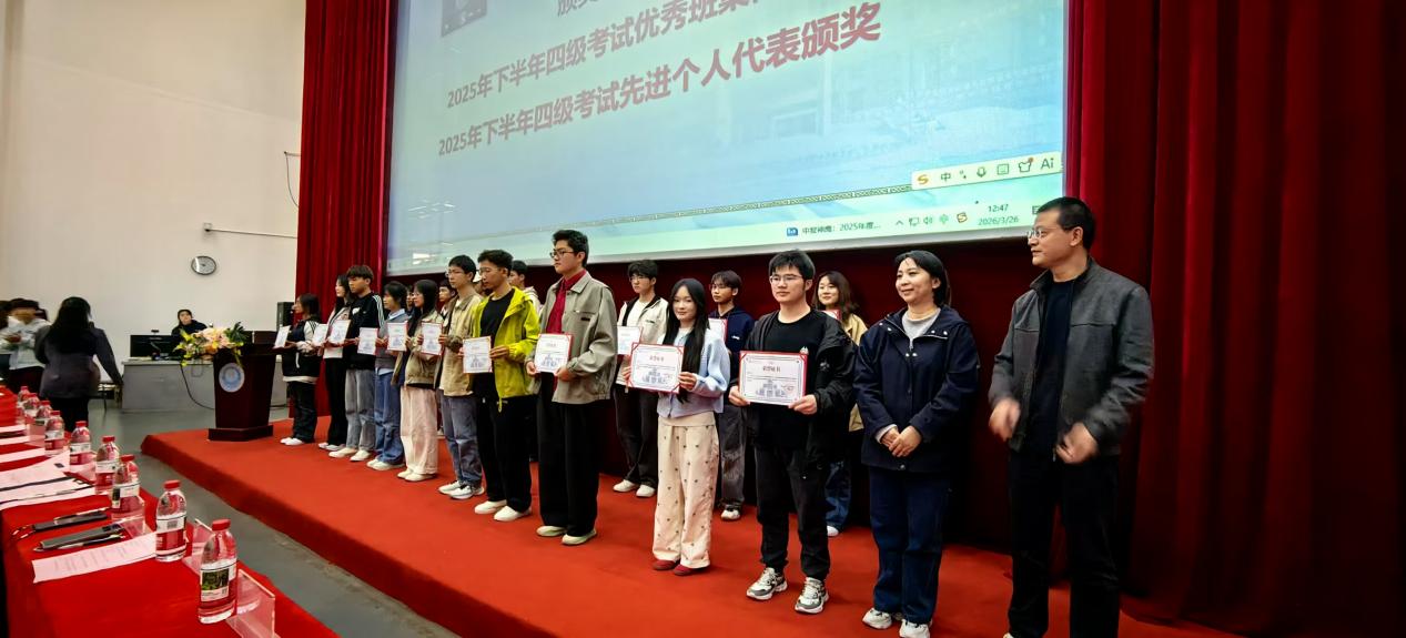 会议伊始,城市学院副院长张超宣读《城市学院关于表彰2025年下半年大学英语四级考试优秀班集体及学风提升先进个人的决定》,对在四级考试中表现突出的19个优秀班集体、18名学风提升先进个人予以表彰。与会领导和老师为学风提升先进集体和个人颁奖。这份表彰既是对同学们勤学善思、奋勇争先的充分肯定,更是对全体学子以先进为标杆、以榜样为力量,潜心向学、奋勇争先的殷切激励。