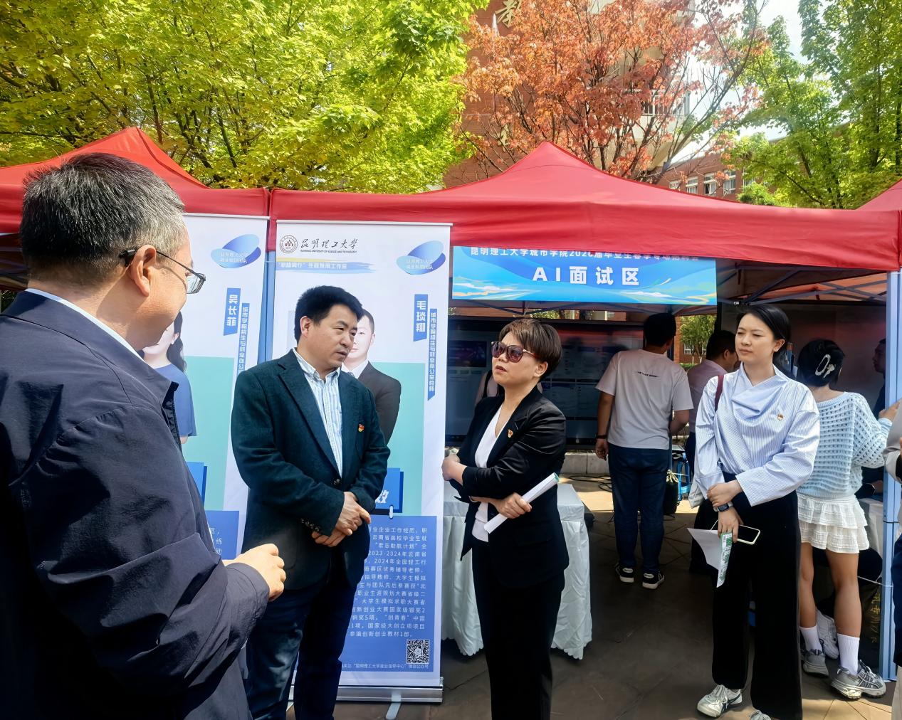 学校党委副书记陈华仙、蔡金红亲临招聘会现场指导工作,走访各企业展位,与用人单位代表及毕业生深入交流。陈华仙在会场分别与中国黄金集团、云南九机等省内外重点企业详细了解了用人单位的招聘需求和学生的就业意向,并具体指导现场设置的“职路同行生涯工作室个体咨询区”“AI简历区”“AI面试区”。
